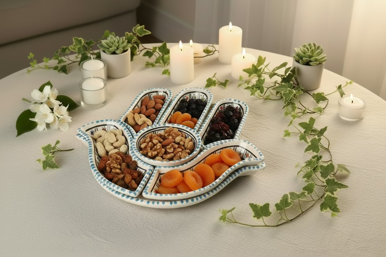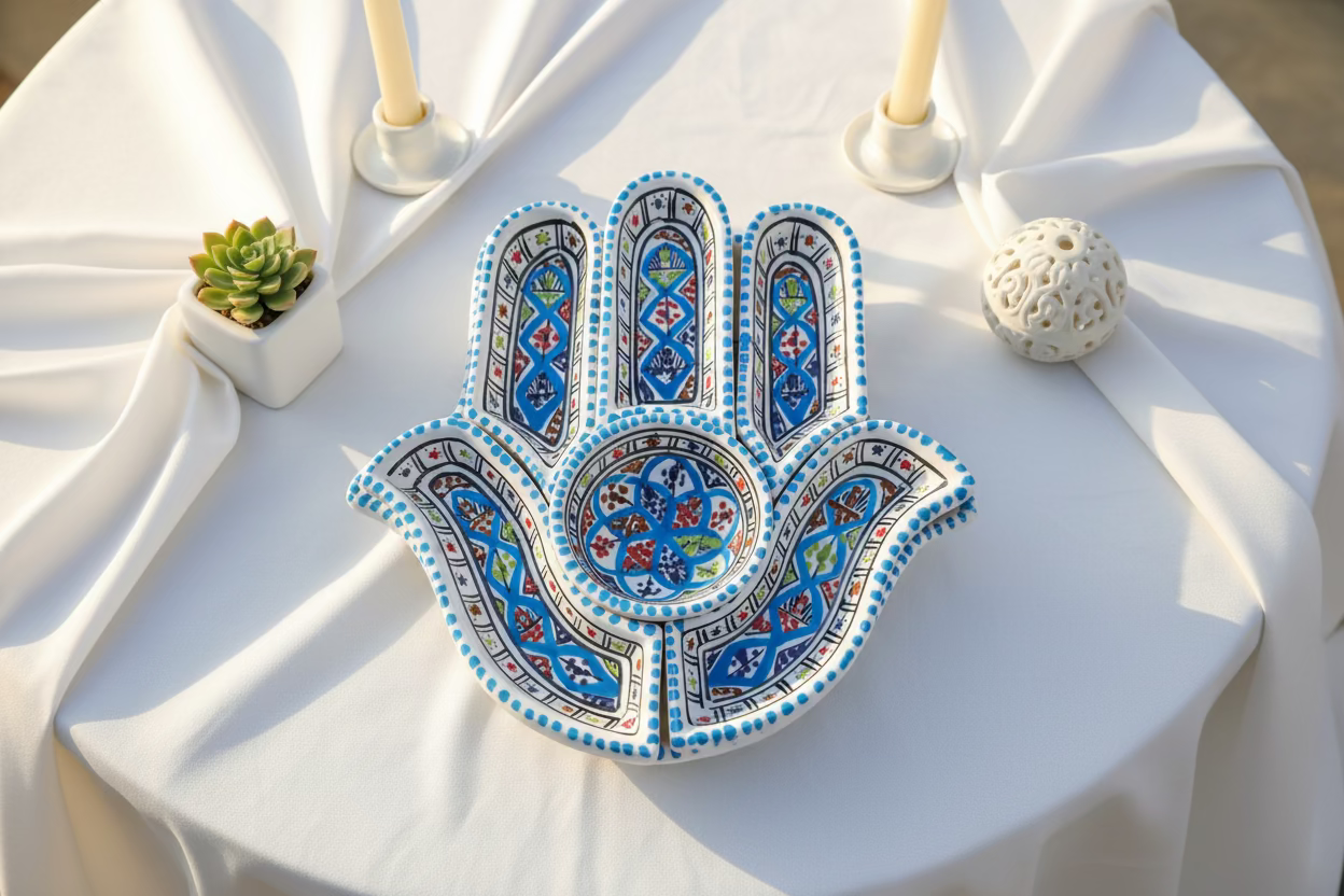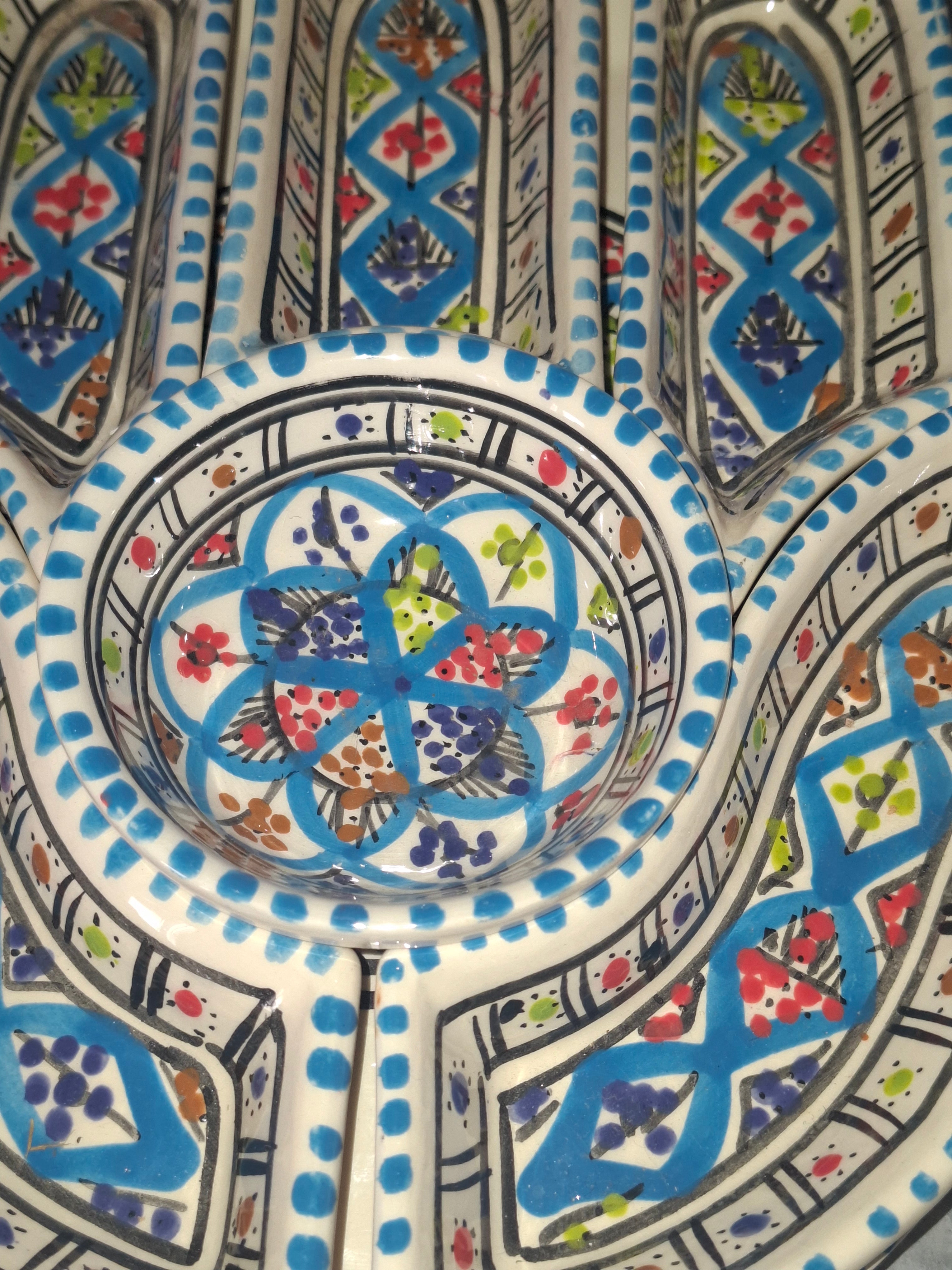 Handgefertigte Tapasschale aus Tunesien mit dem Symbol der Hand der Fatima – ein zeitloses Motiv, das Schutz und Segen symbolisiert. Diese authentische Keramikschale verbindet traditionelle nordafrikanische Handwerkskunst mit praktischer Eleganz. Ideal zum Servieren von Mezze, Oliven oder Nüssen, bringt sie mediterranes Flair auf jeden Tisch. Jedes Stück ist ein Unikat, geprägt durch die individuelle Arbeit des Künstlers. Ein kulturelles Accessoire für Liebhaber authentischer Keramik.