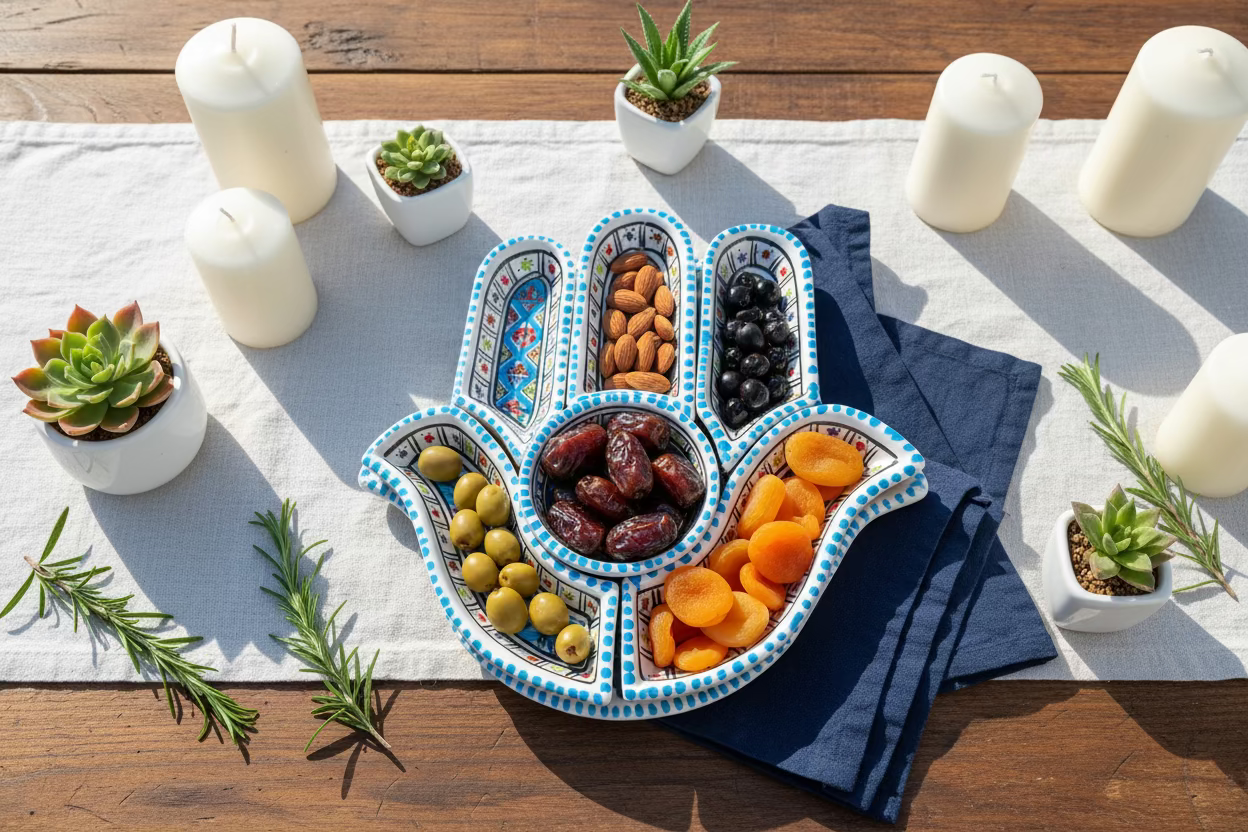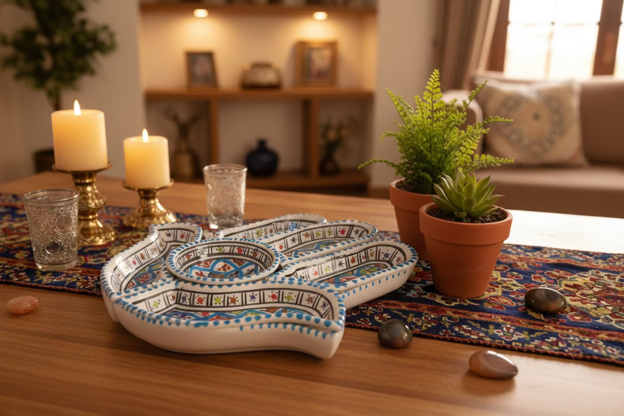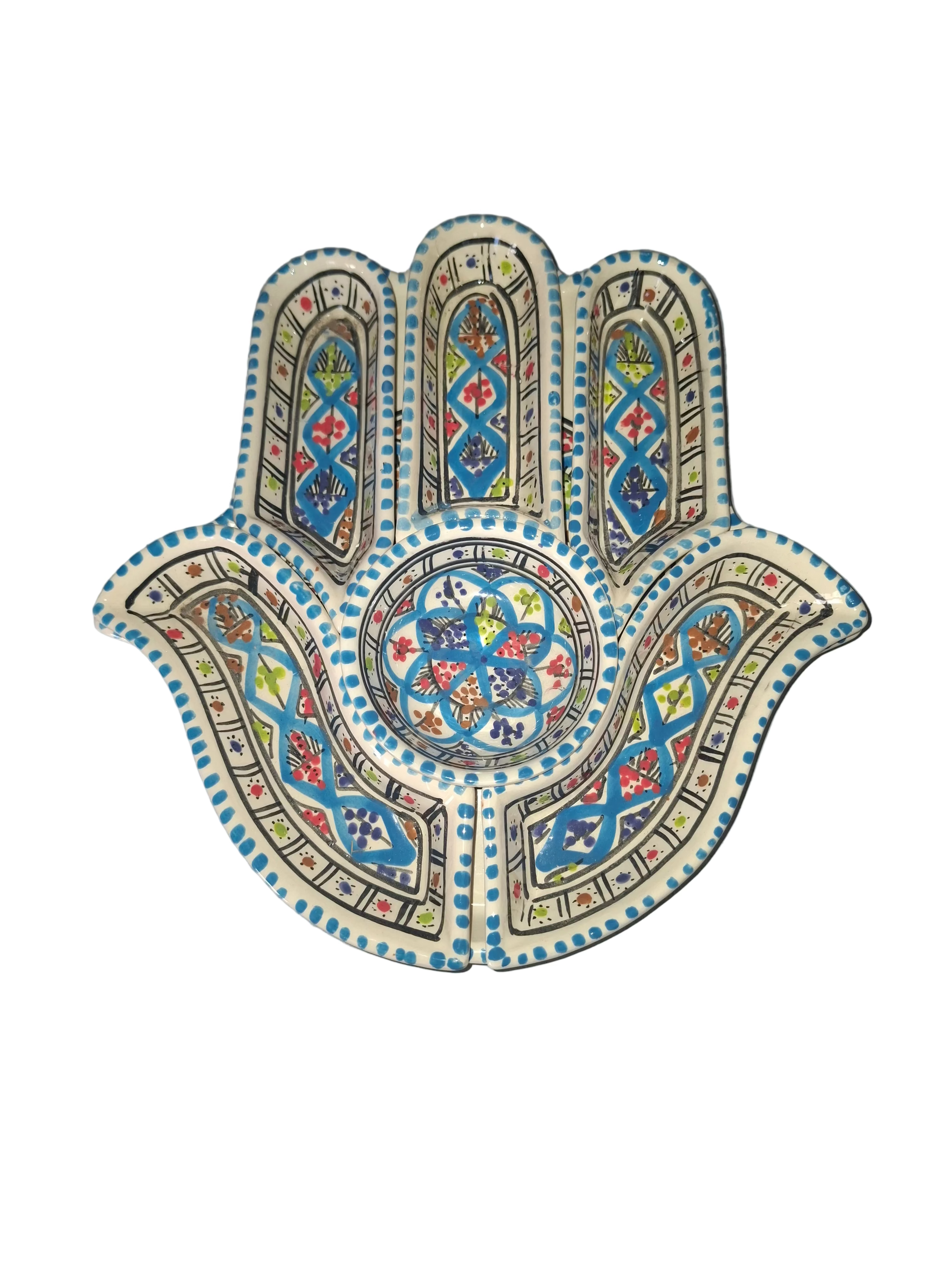 Handgefertigte Tapasschale aus Tunesien mit dem Symbol der Hand der Fatima – ein zeitloses Motiv, das Schutz und Segen symbolisiert. Diese authentische Keramikschale verbindet traditionelle nordafrikanische Handwerkskunst mit praktischer Eleganz. Ideal zum Servieren von Mezze, Oliven oder Nüssen, bringt sie mediterranes Flair auf jeden Tisch. Jedes Stück ist ein Unikat, geprägt durch die individuelle Arbeit des Künstlers. Ein kulturelles Accessoire für Liebhaber authentischer Keramik.